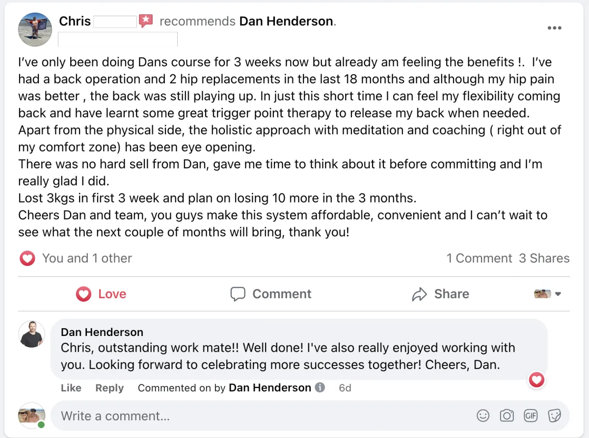 After years of enduring Chronic Non-Specific Lower Back Pain from injury, unhealthy lifestyle choices and ineffective treatments, our founders, Dan Henderson and Laura Fillmann developed The Online Holistic Transformation Program.